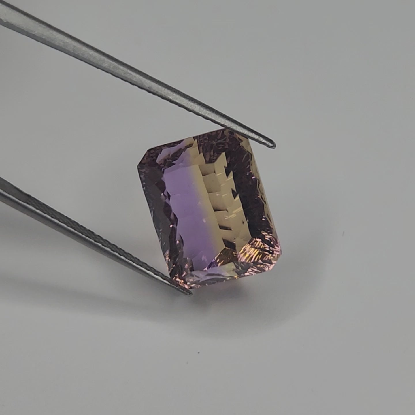 This explosive gem is Ametrine. Found almost exclusively in Bolivia, ametrine is a unique bi-colour combination of amethyst and citrine.