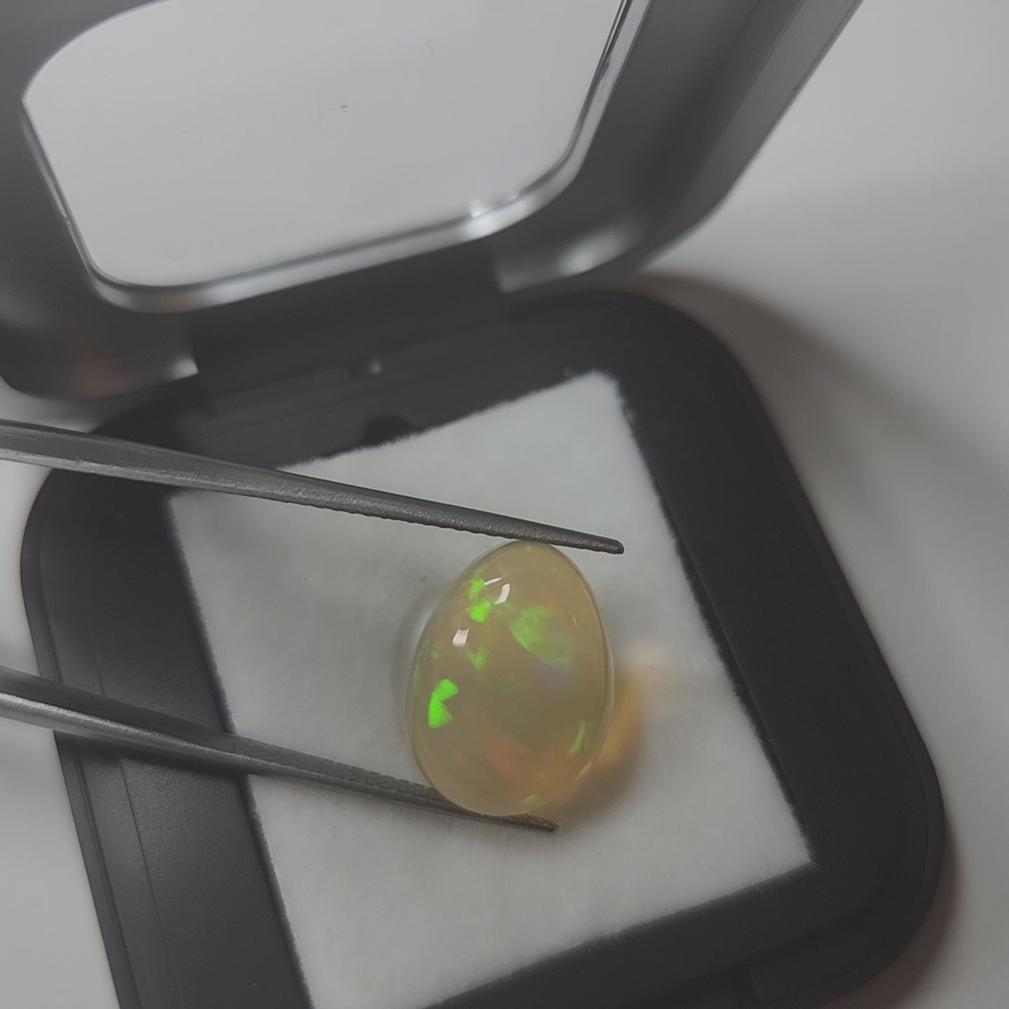 This is a hand cut, Ethiopian Welo Opal. Ehtiopian opal is a hydrophane opal, meaning that it absorbs water. When the stone is wet the base tone may turn white or clear, but fear not, it will return to its original state as the stone dries. Small drops and such seem to have little effect.